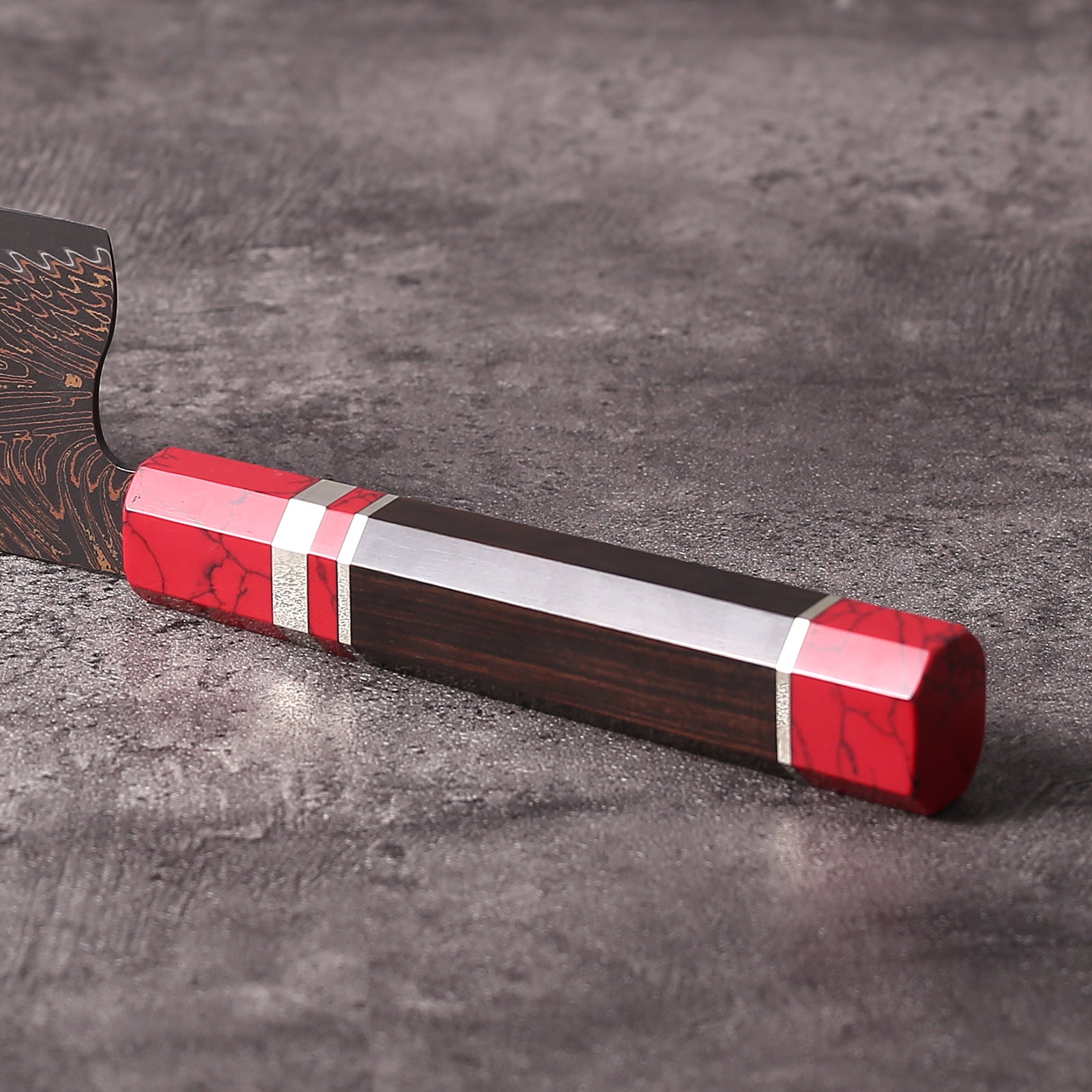 A traditional Japanese Wa handle, crafted from dense South American blackwood and adorned with vivid red turquoise accents. The combination offers both durability and a unique visual contrast, balancing timeless elegance with modern artistry.
